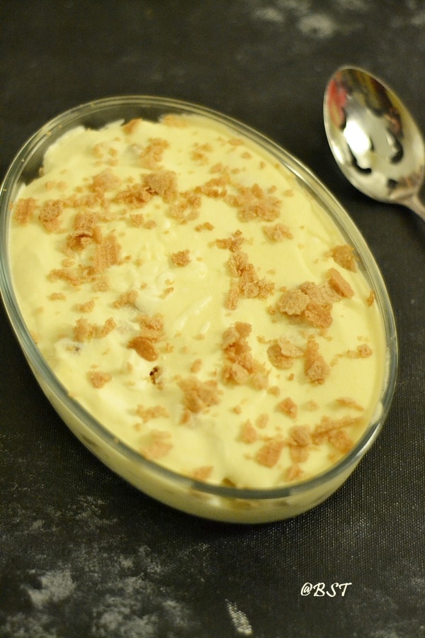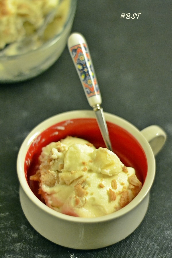 Then comes the custard layer. The pudding is a simple cooked custard folded into some whipped cream, making it light and fluffy. It is advised make the custard in advance so that it gets cooled in time for the assembly. Once assembled, allow it ample resting time for the flavors to mingle, and then just dig in post a heavy lunch. Unlike the Banoffee pie, this pudding is quite light to the tummy and very enjoyable. If you want a more banana-ey flavor, you can try adding some banana essence to the custard, but I thought that the bananas themselves did a good job spreading their flavors throughout the pudding, although they were lying at the bottom. Hehe… Off to this simple recipe…