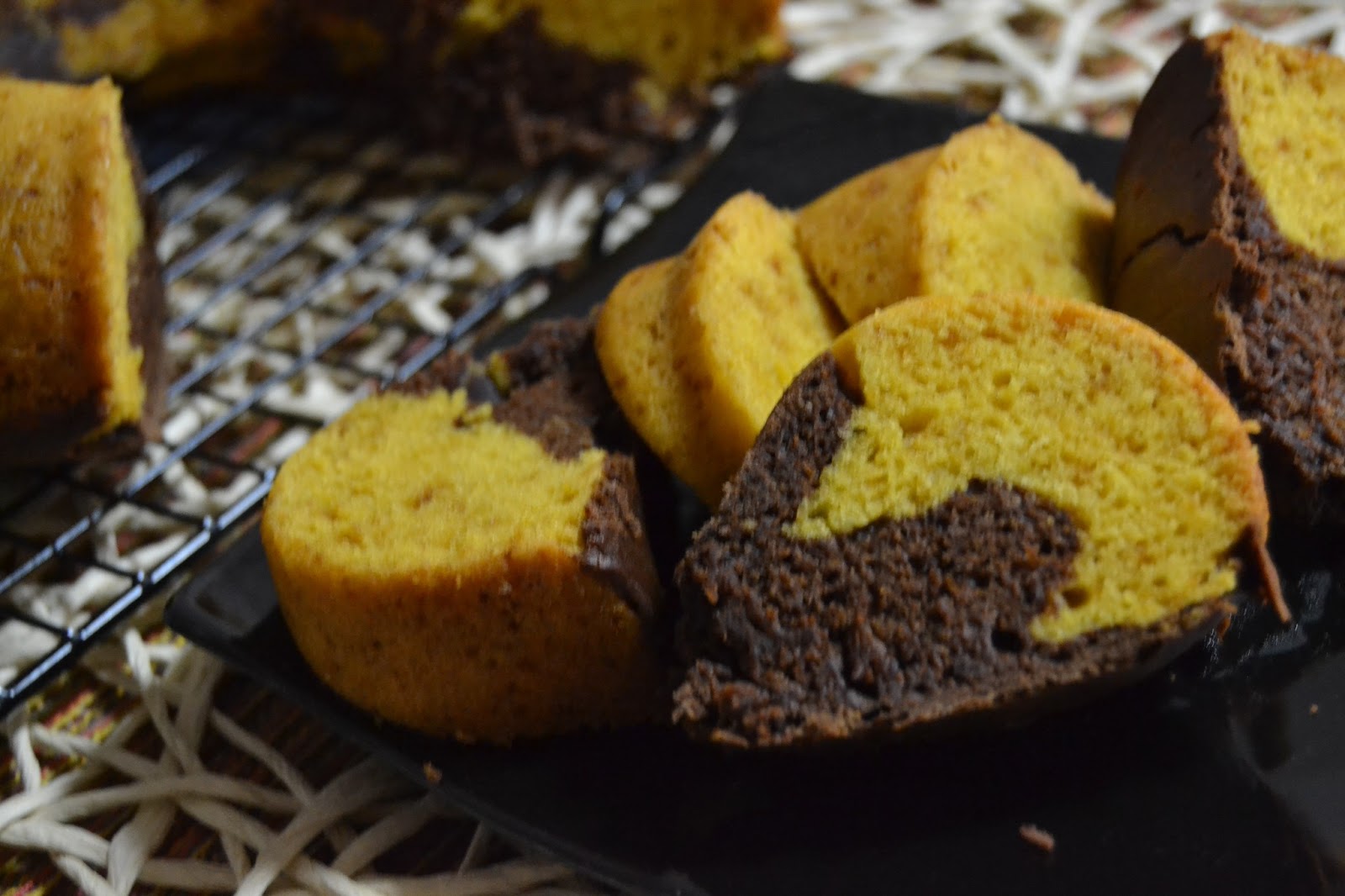 - Pour the mango batter into the prepared bundt at the bottom and the cocoa batter on the top. Tap to level the batter or use a spatula to level.