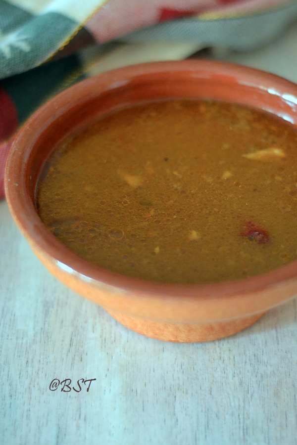 While trying to figure out what to post from my very little drafts, I picked up what was apt for this climate – this kozhi rasam or chicken tangy soup that is like a hug on a warm day… I didn’t know whether to put this as a curry or soup, so I put it under both. Hehe… I have always known only the rasam that umma makes, that when I realized there are rasams made with chicken and meat, it kind of surprised me. But if you really look into it, it is a nice tangy and spicy watered-down soup with small pieces of chicken in it. I used chicken with bone, because that is where all the flavors are. But to make sure that it cooks easily, it is best to get your butcher to cut them into really small pieces or another way is to use chicken bones, if you don’t want too much meat in your soup.