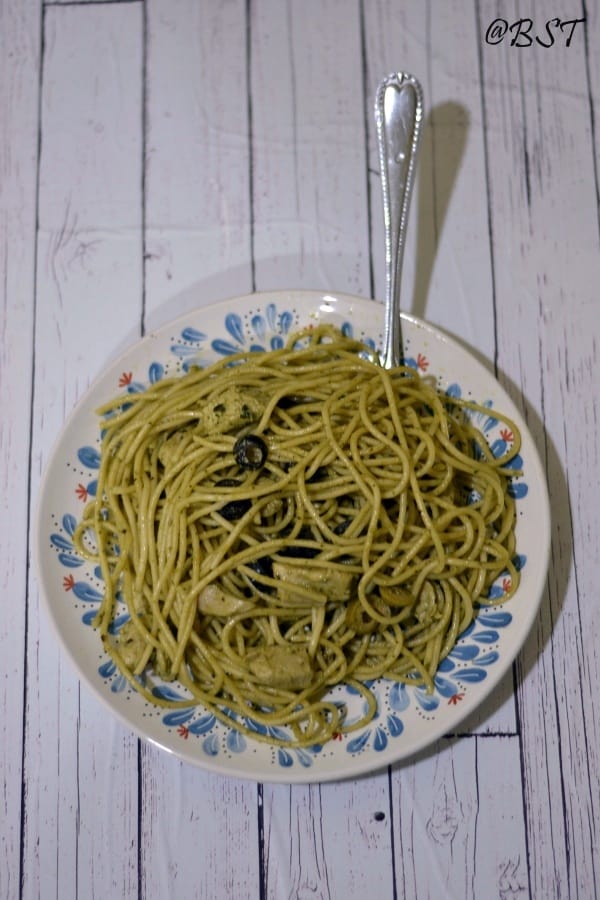 A simple delicious spaghetti tossed in freshly made pesto, chicken and olives…