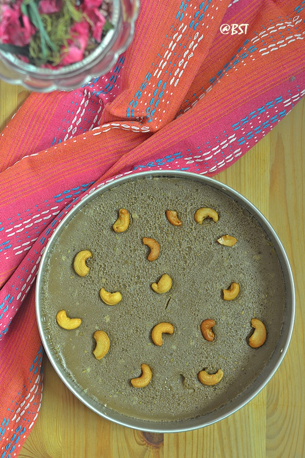 • Steam it for 15-20 minutes till set. Through the halfway stage, drop in the cashewnuts on top and continue till done. When touched, the top portion will be non-sticky.